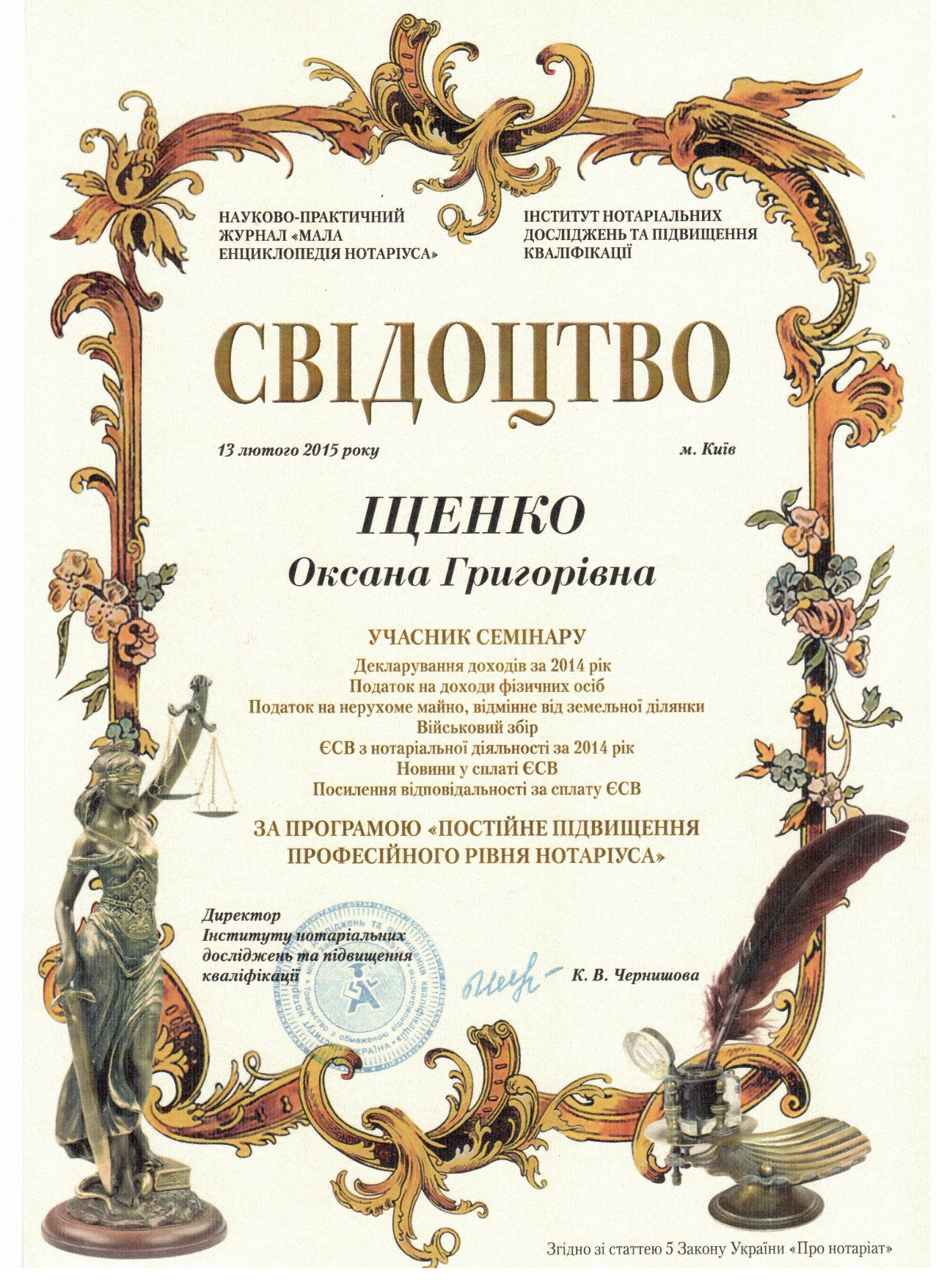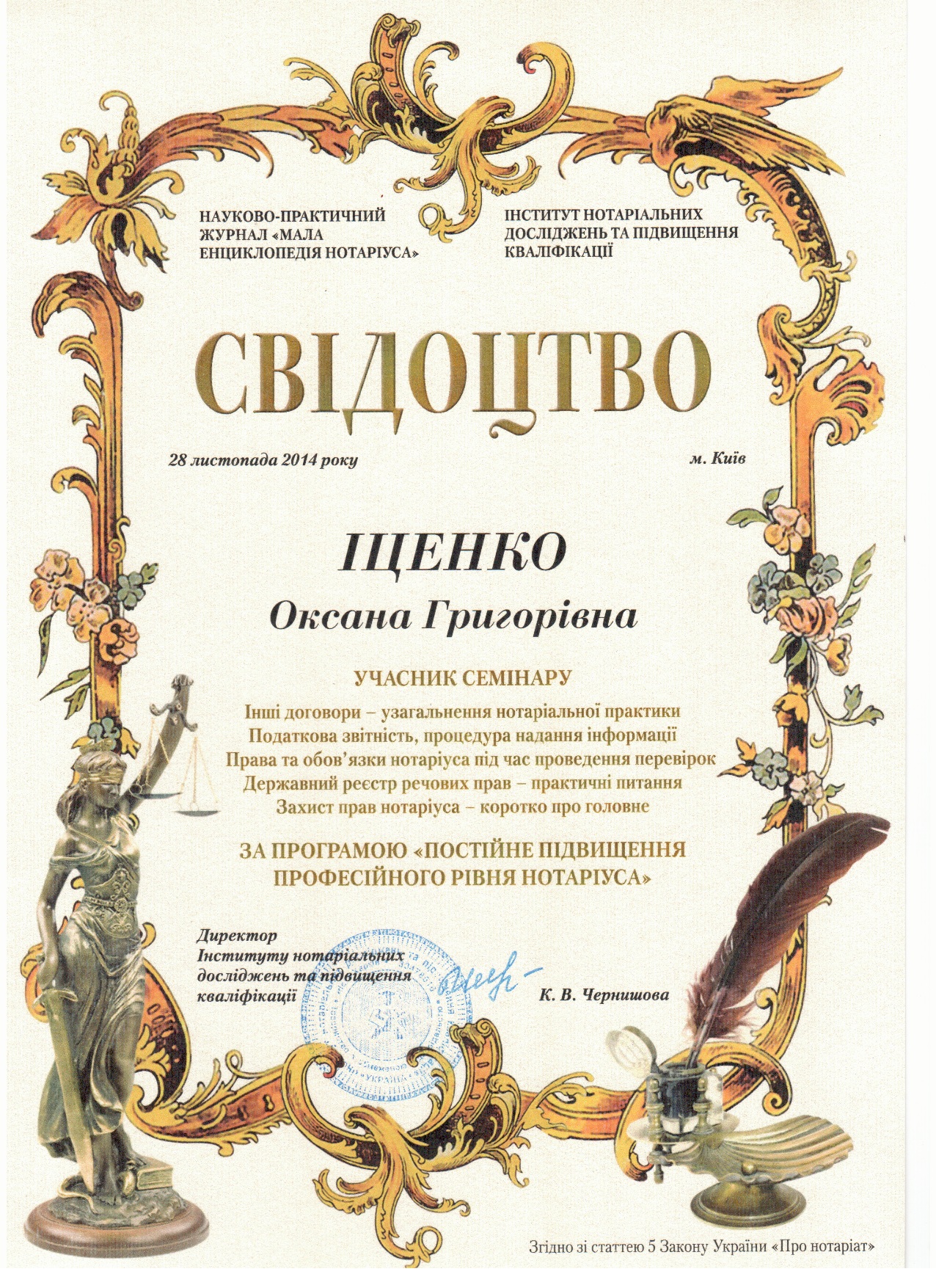 Нотариус Харьковское Шоссе — Иценко Оксана Григорьевна постоянно повышает свою квалификацию.
